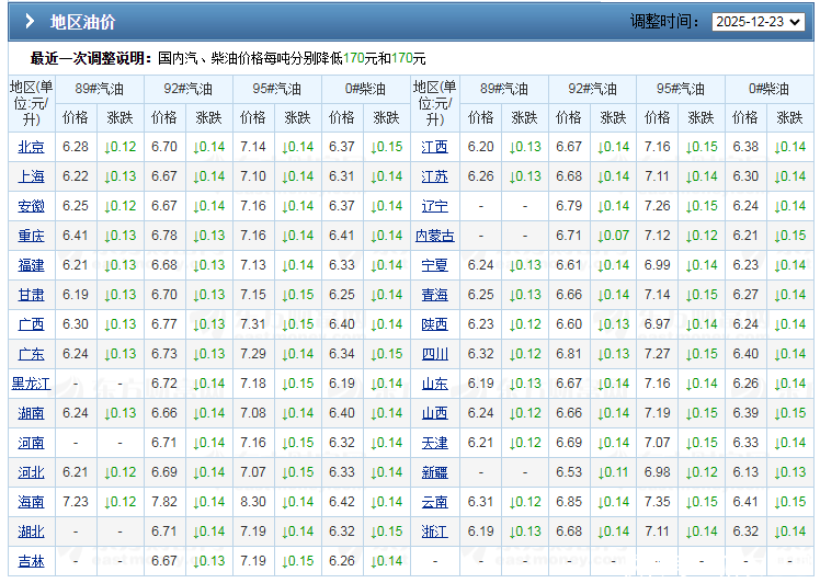 据悉,基于国内汽柴油形成机制,由于上次调价,2026年第1次调整,汽柴油以搁浅落幕,目前,国内汽柴油处于阶段性新低,以北京为例,92汽油报价6.7元/升,相比2025年1月1日下降0.74元/升,相比2025年1月末下降达到1.07元/升,油价处于阶段性低值,居民用车成本显著减少,各地汇总报价参考文末配图!