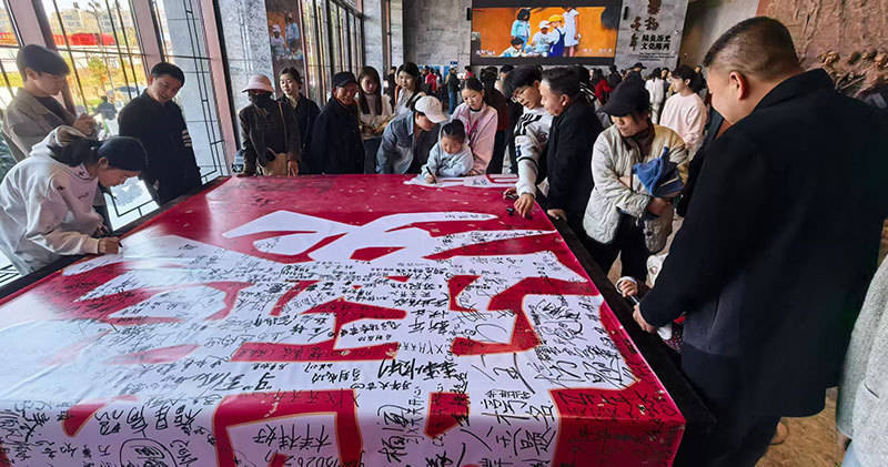走进陆良县博物馆大厅,20米长、3米宽的巨幅红布上印着3个硕大的爨字,特别引人注目,游客纷纷拿起主办方准备好的笔,在巨幅红布上写上各种祝福语,有祝福家人身体健康,有祝同学学业有成,也有祝自己马年马到功成等等。“过去,我们的博物馆更多是供人参观浏览的场所;而现在,这里增加了许多可供游客动手操作的互动项目,让他们能更直观地了解爨文化,也更愿意走进博物馆。”带着孩子前来体验的市民曹飞感慨道。