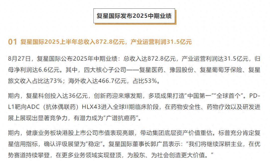 集团层面看,2025年上半年,复星国际实现营业收入872.83亿元,较2024年同期下降10.78%;归属于母公司股东的利润为6.61亿元,同比下降8.19%。复星系旗下公司的经营情况方面,根据最新财报,集团核心子公司之一的复星医药2025年前三季度实现营业收入293.93亿元,同比下滑近5%;归母净利润25.23亿元,同比增长25.5%。从单季度表现看,复星医药去年第三季度归母净利润同比增幅仅为4.52%,而第一与第二季度归母净利润均实现两位数以上的增长。