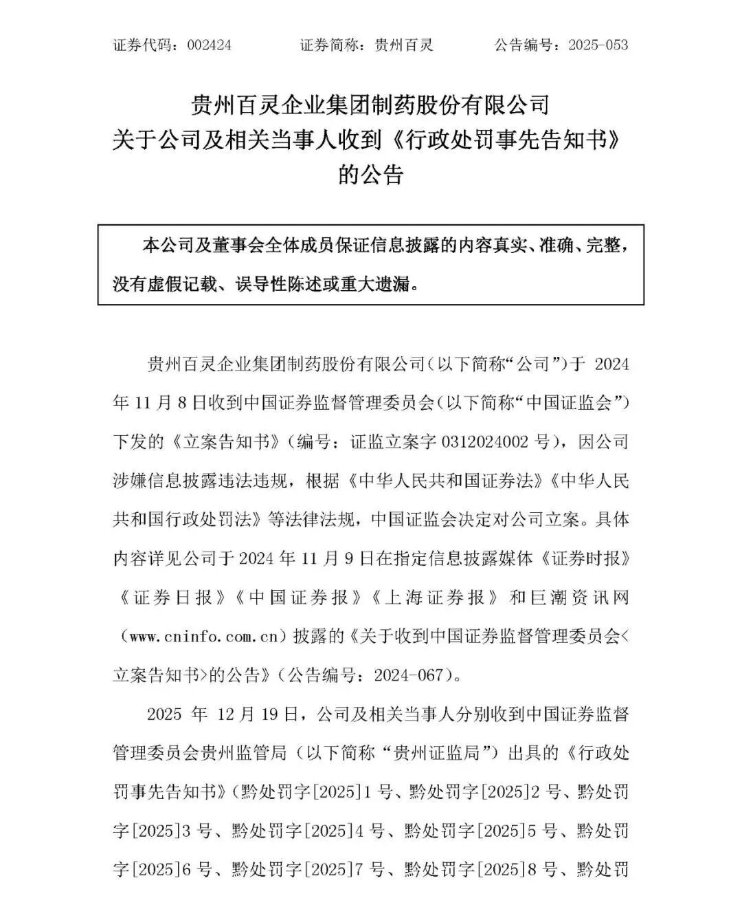 2024年11月,因涉嫌信息披露违法违规,证监会决定对贵州百灵(维权)立案调查。至今历时已逾一年,初步处罚结论终于出炉。