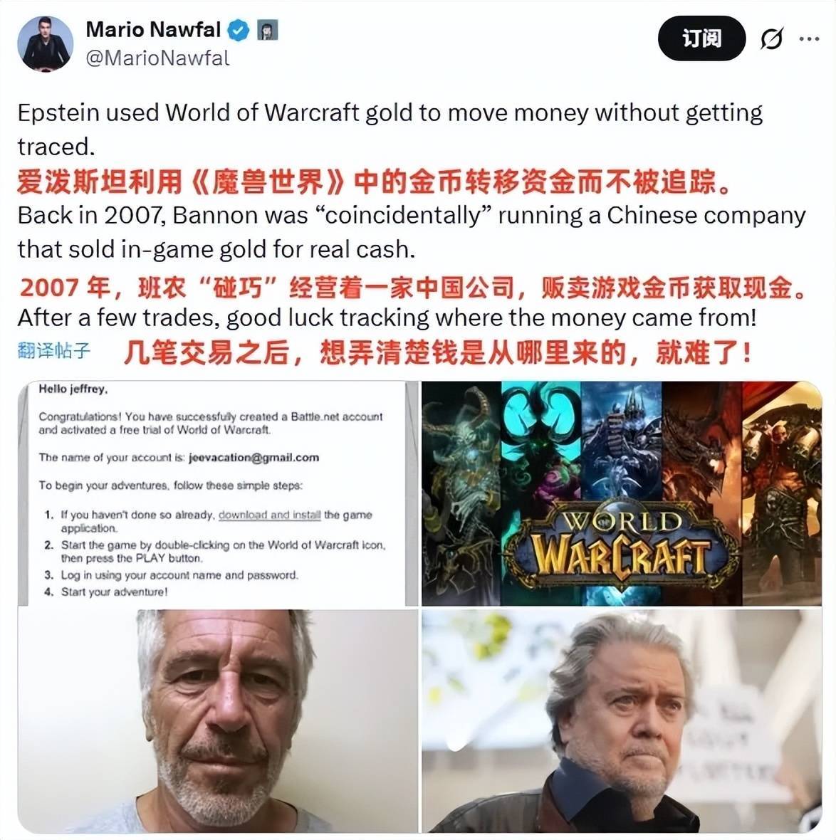 就在昨天,知名X博主Mario Nawfal就发布了一则“新”开出来的消息:他声称,爱泼斯坦曾经用《魔兽世界》的游戏金币“洗钱”,还把特朗普的前高级幕僚史蒂夫·班农扯了进来。