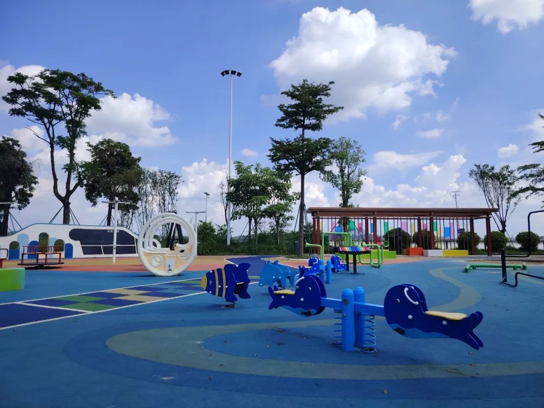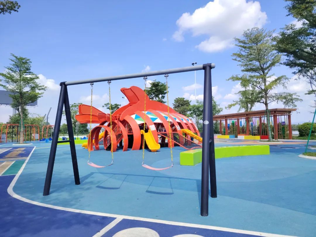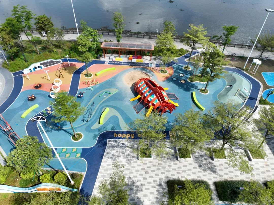 其中,面积达1630平方米的儿童乐园是长廊的核心亮点,园内配备了大鱼滑梯、迷你攀岩点、儿童健身器材等多样化儿童设施,为不同年龄段儿童打造了一个安全益智的活力天地。同时,一条蜿蜒的彩色健身跑道贯穿了整个长廊,不仅满足市民散步健身的需求,也成为大家亲近自然、欣赏生态美景的纽带。