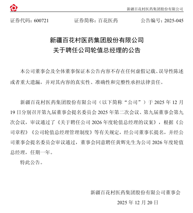 12月20日,新疆百花村医药审议通过了《关于聘任公司2026年度轮值总经理的议案》,经公司董事长提名,并经公司董事会提名委员会审议通过广东股票配资开户,董事会同意聘任黄辉先生为公司2026年度轮值总经理,任期一年。